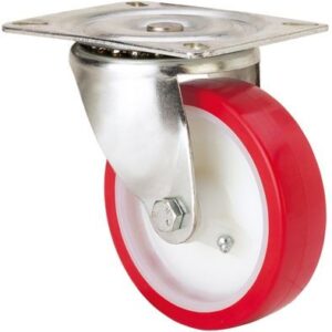 Ruedas con núcleo de nylon blanco y banda de poliuretano rojo inyectado de dureza 90-95º shoreA. Especialmente indicada para soportar cargas hasta 450 Kg.
