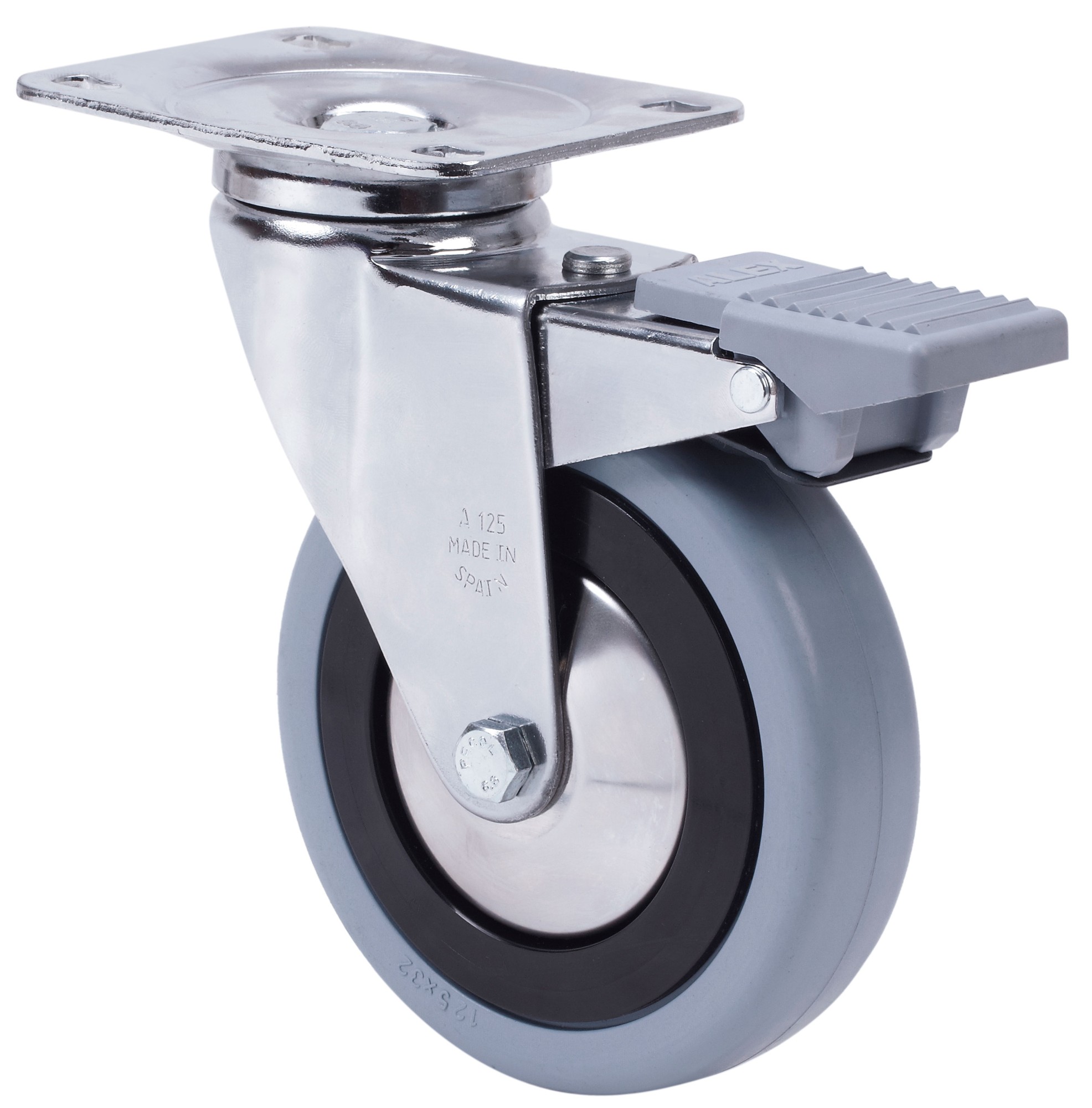 Ruedas con núcleo de poliamix y banda de goma gris. Especialmente indicadas para soportar cargas hasta 100 Kg.