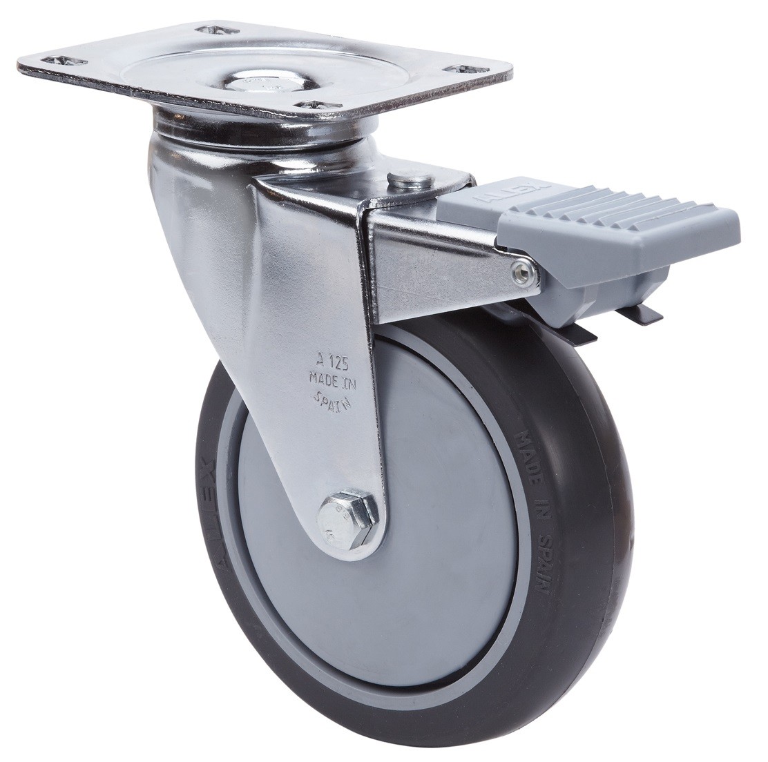 Ruedas con núcleo de poliamix y banda de goma gris termoplásticas. Especialmente indicadas para soportar cargas hasta 100 Kg.