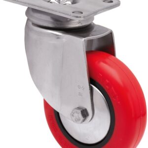 Ruedas de poliuretano inyectado con núcleo de poliamix con todos sus componentes de acero inoxidable (AISI 304). Especialmente indicada para soportar cargas hasta 80 Kg.