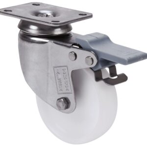 Ruedas de poliamix blanco, con todos sus componentes de acero inoxidable (AISI 304). Especialmente indicada para soportar cargas hasta 80 Kg.