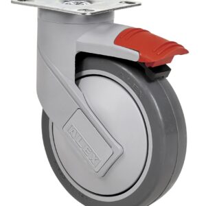 Rueda de goma termoplástica gris inyectada. Soporte fabricado en poliamida de alta calidad endurecida con fibra de vidrio. Cabezal giratorio superior construido en doble hilera de bolas endurecidas (fijación placa y agujero pasante) y cojinete de bolas de precisión insertado (fijación espiga roscada). Especialmente indicadas para soportar cargas hasta 100 Kg.