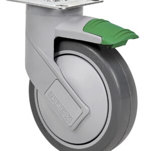 Rueda de goma termoplástica gris inyectada. Soporte fabricado en poliamida de alta calidad endurecida con fibra de vidrio. Cabezal giratorio superior construido en doble hilera de bolas endurecidas (fijación placa y agujero pasante) y cojinete de bolas de precisión insertado (fijación espiga roscada). Especialmente indicadas para soportar cargas hasta 100 Kg.