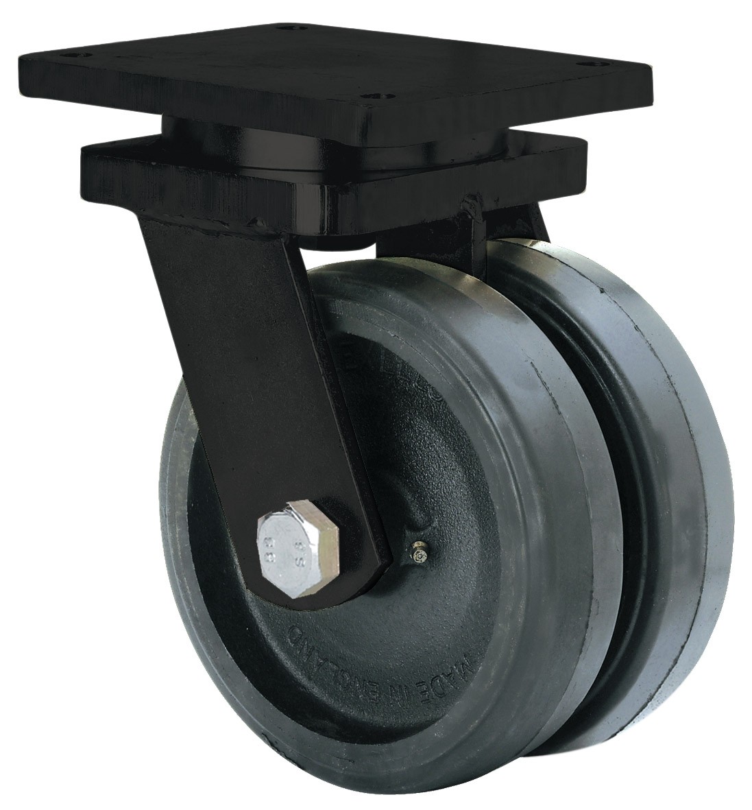 Rueda doble con núcleo de acero y banda de goma negra natura. Especialmente indicada para soportar altas cargas de hasta 1.400 Kg.