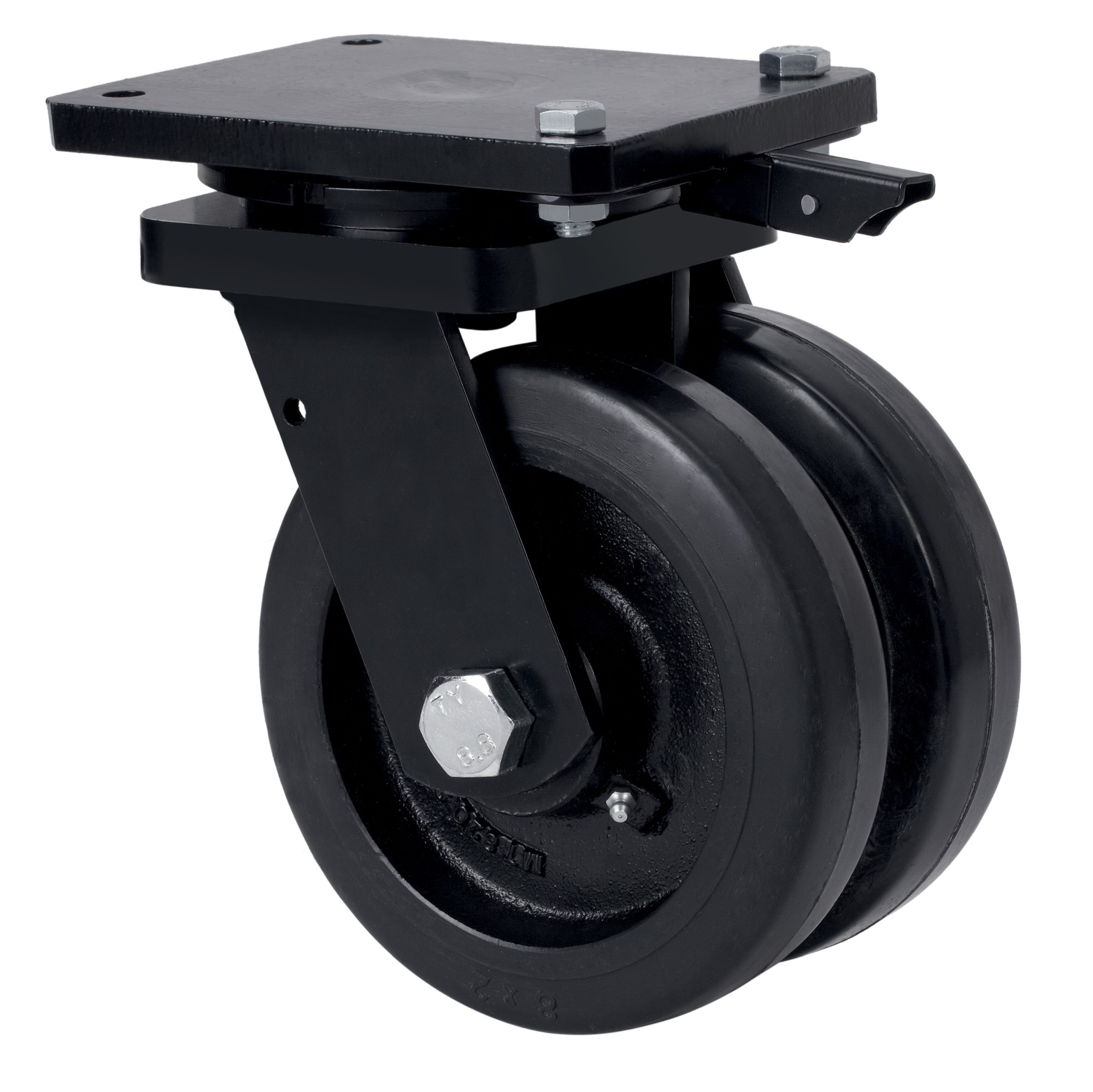 Rueda doble con núcleo de acero y banda de goma negra natura. Especialmente indicada para soportar altas cargas de hasta 1.400 Kg.