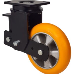 Ruedas con núcleo de aluminio y banda de poliuretano fundido con dureza de 95˚ Shore A con banda de rodadura en forma balona, especialmente indicada para soportar altas cargas hasta 800 Kg. Con soporte de suspensión elástica mediante incorporación de muelle muy resistente para absorber golpes, choques y desniveles. Recorrido de suspensión hasta 25mm., ideal en suelos irregulares donde su amortiguación actúa.
