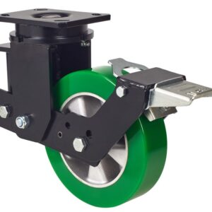 Ruedas con núcleo de aluminio y banda de poliuretano verde fundido de dureza 80º Shore A. Especialmente indicada para soportar cargas hasta 700 Kg. Con soporte de suspensión elástica mediante incorporación de muelle muy resistente para absorber golpes, choques y desniveles. Recorrido de suspensión hasta 25mm., ideal en suelos irregulares donde su amortiguación actúa.