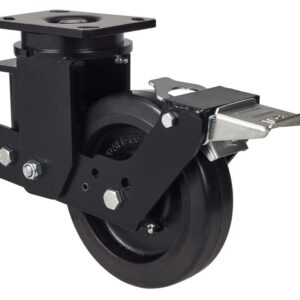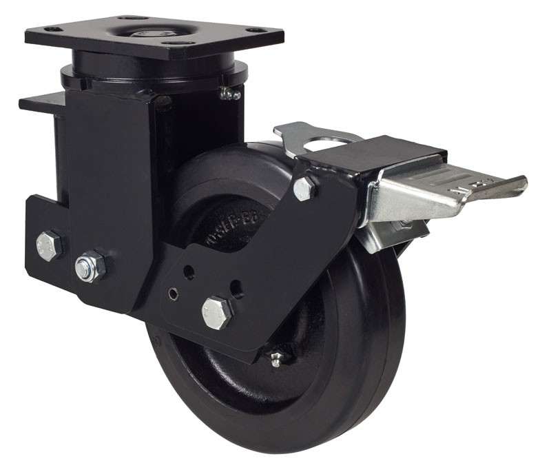 Ruedas con núcleo de acero y banda de goma negra natura. Especialmente indicada para soportar altas cargas de hasta 750 Kg. Con soporte de suspensión elástica mediante incorporación de muelle muy resistente para absorber golpes, choques y desniveles. Recorrido de suspensión hasta 25mm., ideal en suelos irregulares donde su amortiguación actúa.