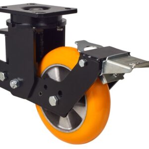 Ruedas con núcleo de aluminio y banda de poliuretano fundido con dureza de 95˚ Shore A con banda de rodadura en forma balona, especialmente indicada para soportar altas cargas hasta 800 Kg. Con soporte de suspensión elástica mediante incorporación de muelle muy resistente para absorber golpes, choques y desniveles. Recorrido de suspensión hasta 25mm., ideal en suelos irregulares donde su amortiguación actúa.