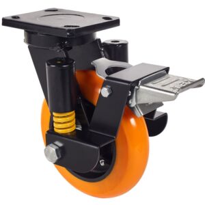 Ruedas con núcleo de acero y banda de poliuretano fundido con dureza de 95˚ shore A con banda de rodadura en forma balona, especialmente indicada para soportar altas cargas hasta 800 Kg. Con soporte de suspensión elástica mediante incorporación de muelle muy resistente, ideal en suelos irregulares donde su amortiguación actúa.