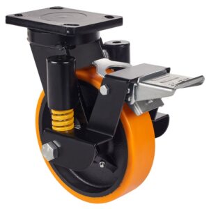 Ruedas con núcleo de acero y banda de poliuretano fundido con dureza de 95˚ shore A, especialmente indicada para soportar altas cargas hasta 1.250 Kg. Con soporte de suspensión elástica mediante incorporación de muelle muy resistente, ideal en suelos irregulares donde su amortiguación actúa.