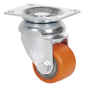 Ruedas con núcleo metálico y banda de poliuretano vulcanizado con una dureza 95˚ shore A. Especialmente indicada para soportar cargas hasta 100 Kg con mínima altura.