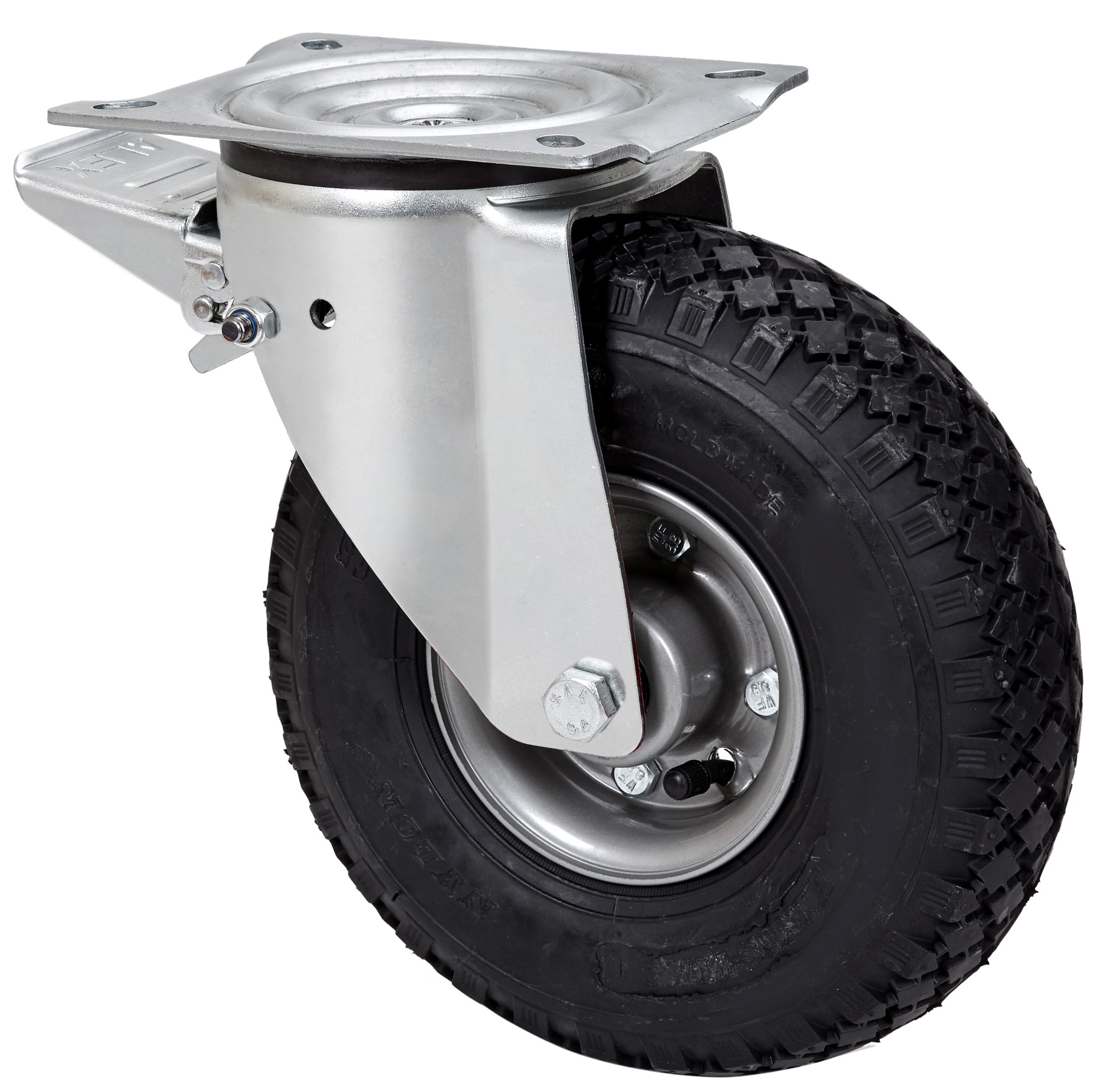 Ruedas color negro, con llanta de poliamix y cubierta neumática de 4 y 6 lonas especialmente indicadas para soportar cargas hasta 220 Kg.