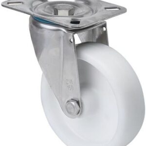 Ruedas de poliamix blanco con todos sus componentes de acero inoxidable (AISI 304). Especialmente indicada para soportar cargas hasta 400 Kg.