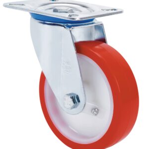 Ruedas con núcleo de nylon blanco y banda de poliuretano rojo inyectado de dureza 90-95º shoreA. Especialmente indicada para soportar cargas hasta 400 Kg.