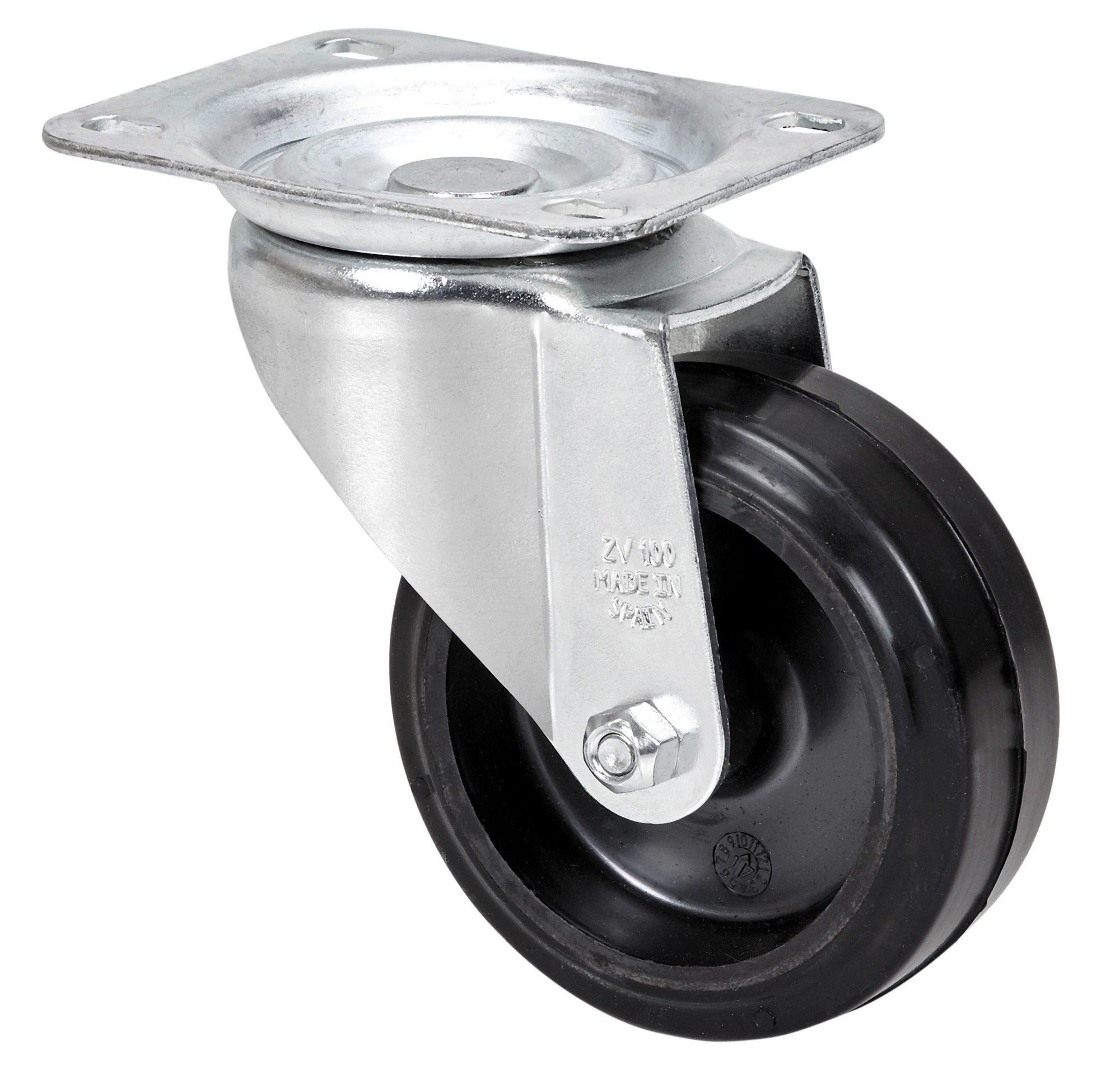 Ruedas de goma negra, especialmente indicada para soportar temperaturas de hasta +250ºC en intervalos de 30 minutos. Soportan cargas hasta 100 Kg.