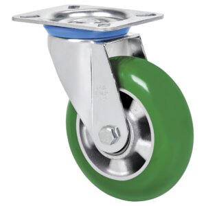 Ruedas con núcleo de aluminio y banda de forma balona de poliuretano verde de dureza 80º shoreA. Especialmente indicada para soportar cargas hasta 650 Kg.