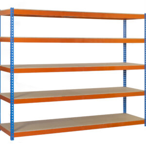 Estanteria metalica media carga de color azul/naranja/madera con 5 alturas. Contiene 10 baldas de aglomerado, 2 baldas para cada altura, una de las baldas más larga que la otra.Tiene una capacidad de carga por estante de 400 kg y una capacidad total de 2000 kgs.Con unas medidas en mm de 2500x1500x600.Fabricada en Espa¤a por Simonrack y se monta rápido siguiendo las instrucciones. Incluye 1 refuerzo por altura.