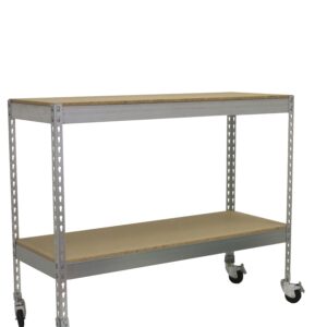 Estanteria metalica media carga con ruedas,de color galva/madera con 2 alturas. Contiene 4 baldas de aglomerado, 2 baldas para cada altura, una de las baldas más larga que la otra. Con ruedas. Al llevar ruedas, su capacidad de carga total es de 120 kg repartidos de manera uniforme, carga certificada a punto de flexi¢n, no de rotura.Con unas medidas en mm de 900x1500x450.Fabricada en Espa¤a por Simonrack y se monta rápido siguiendo las instrucciones. Incluye 1 refuerzo por altura.