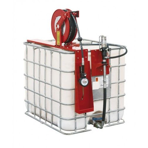 Con aspiración a toma inferior del contenedor, bastidor de anclaje por el lateral con soporte L antigoteo, enrollador de manguera y pistola contadora electrónica con preselección.