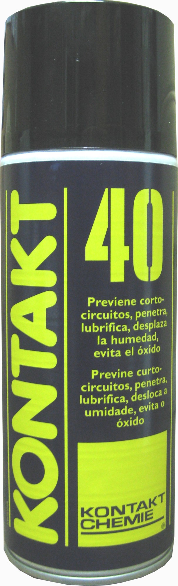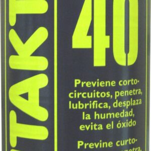 Spray de mantenimiento. Lubricante multiusos que previene los fallos eléctricos y electrónicos causados por la humedad, la condensación y la corrosión. Kontakt 40 es un aceite penetrante fiable, un lubricante, desplaza el agua e inhibe la corrosión. Restaura la baja resistencia de contactos y evita las fugas de corriente. Equipado con una válvula de 360º que facilita la aplicación en posición invertida.