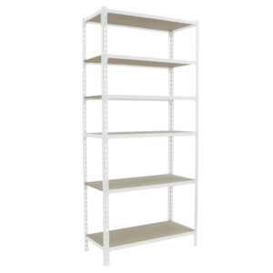 Estanter¡a metálica sin tornillos de color BLANCO/MADERA con capacidad de carga por estante de 150 kg. El n£mero de estantes es 6 y las medidas (alto x ancho x fondo) son 2500x900x500 mm. Tiene estantes de aglomerado de 12 mm. Producto espa¤ol de calidad europea, podrás encontrar las instrucciones de montaje en su interior o en este enlace: https://www.youtube.com/watch?v=J8R6iEhkKA0&t=3s. Medidas en uso del producto: 2510x877x510 mm