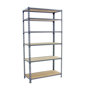 Estanteria metalica sin tornillos, de color gris/madera con 6 estantes de madera.Tiene una capacidad de carga por estante de 200 kg y una capacidad total de 1200 kgs.Con unas medidas en mm de 2500x1200x300.Fabricada en Espa¤a por Simonrack y se monta rápido siguiendo las instrucciones
