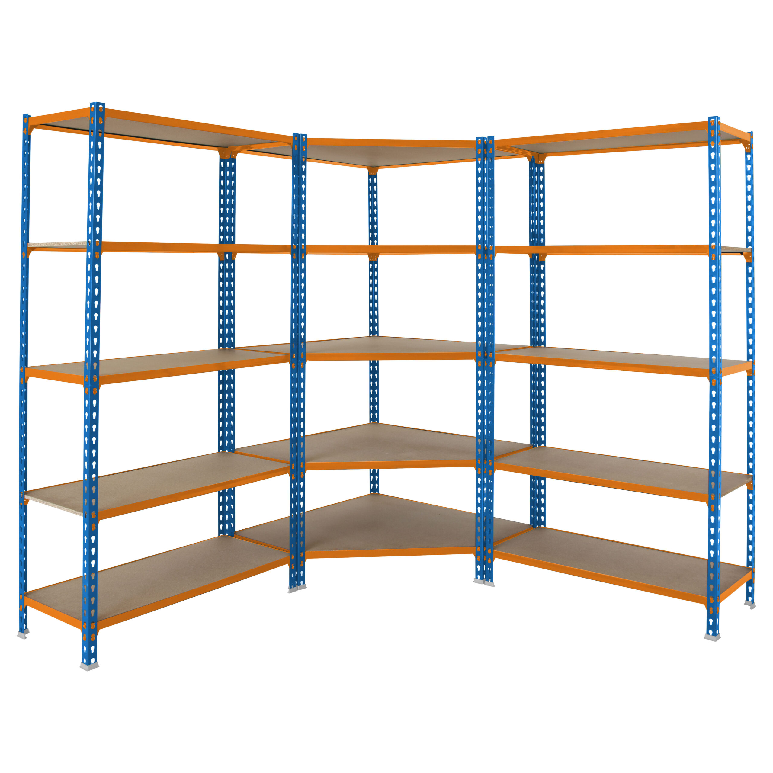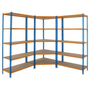 Pack formado por estanteria metálica esquinera sin tornillos con bandejas de aglomerado y 2 estanterias maderclick 5-400 con bandejas de aglomerado, de color AZUL/NARANJA/MADERA.La estanteria esquinera tiene un total de 5 estantes que soportan 200 kg cada uno de ellos, carga certificada a punto de flexion. Las dos estanterias maderclick 5-400 que van con ella tienen 5 estantes cada una y soportan 150 kg cada uno de los estantes. Incluye bandejas de aglomerado y 13 pies de plástico blancos. Contiene perfiles partidos. Dimensiones de cada una de las 2 estanterias no esquineras (alto x ancho x fondo): 1800x900x400 mm. No se tambalea y no necesita anclaje a la pared. Montaje fácil y rápido sin tornillos, con sistema click. Producto fabricado en Espa¤a.