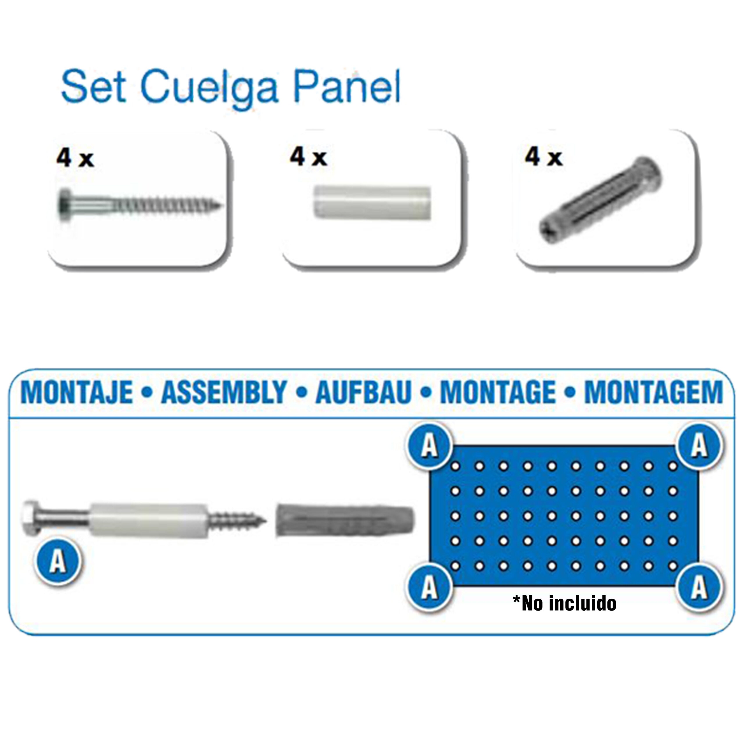 Set cuelga panel para colgar panel perforado en la pared. El set consta solo de los accesorios que necesitan para colgar el panel. Importante: el perfil tiene que ir dentro del panel y puesto del revés. Los tornillos de la pared no deben introducirse del todo en el taco ya que lo que sobresale es el apoyo del panel. Producto fabricado en Espa¤a.
