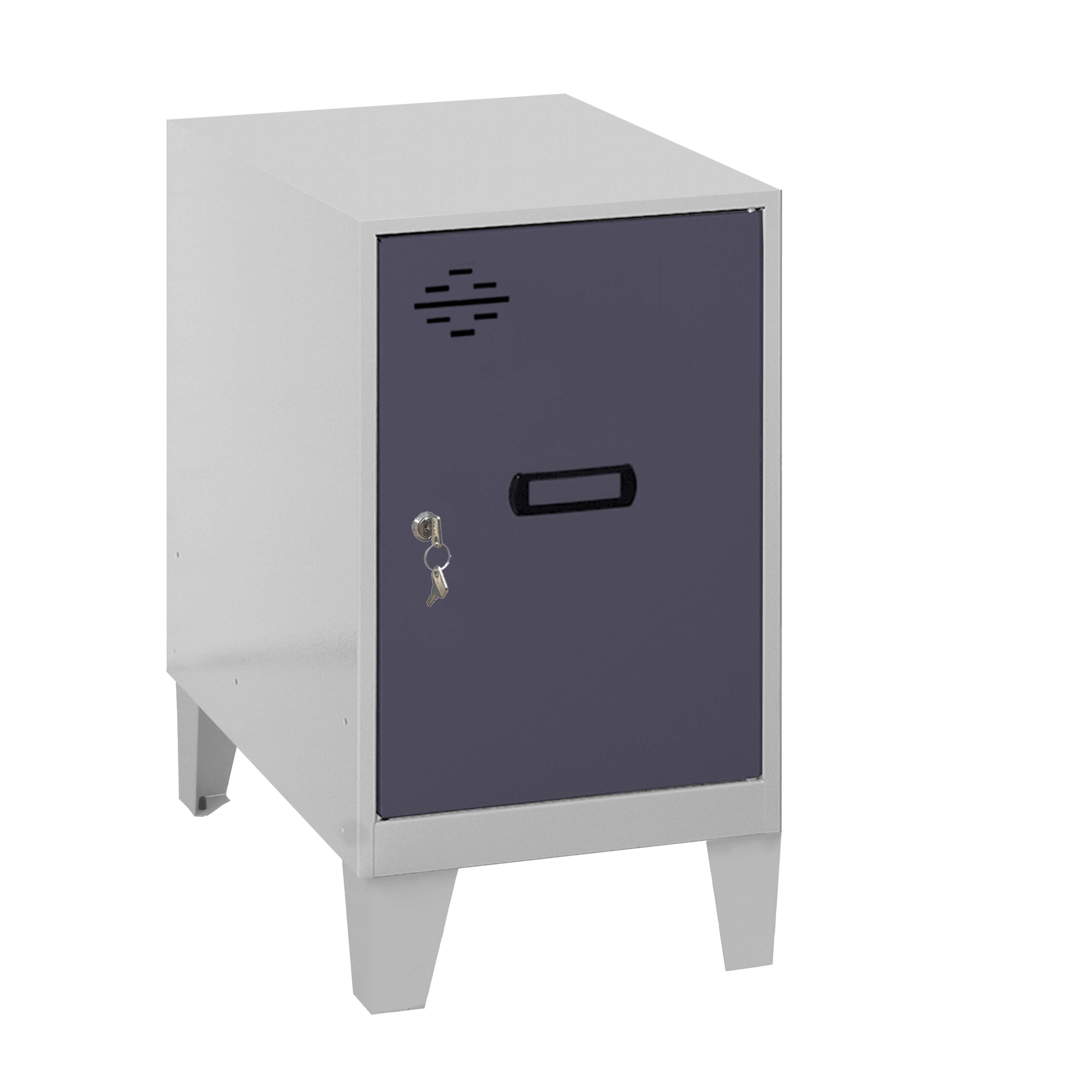 Casillero metálico mini con patas de color GRIS y las puertas ANTRACITA. Las dimensiones son575x300x500 mm. Se entrega montado e incluye un respiradero para mantener el interior ventilado, una cerradura de cilindro con dos llaves que se puede cambiar bajo pedido por cualquiera de las otras cerraduras de Simonrack y un etiquetero para aportar informaci¢n acerca de su uso o su propiedad. Este casillero mini se puede acoplar fácilmente a otro casillero Simonrack del mismo tama¤o o superior, del mismo o distinto color, adaptándose perfectamente al espacio que necesite el usuario, comb¡nalos como quieras. Ideal para poner debajo de la mesa, en el ba¤o para guardar toallas, en un vestuario etc.