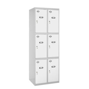 Casillero metálico de 2 cuerpos con 6 puertas de color gris y las puertas blancas. Las dimensiones son 1800x600x500 mms. Se entrega montado e incluye una cerradura, respiradero y etiquetero para mayor comodidad del usuario.