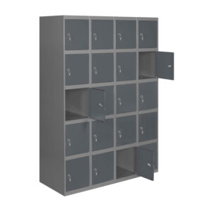 Casillero metálico de 4 cuerpos de color gris y 20 puertas de color antracita. Las dimensiones son 1800x1200x500 mms. Se entrega montado e incluye una cerradura, respiradero y etiquetero para mayor comodidad del usuario.