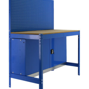 Banco de trabajo sin tornillos con bandejas de madera. Tiene 2 estantes y una capacidad de carga de 600 kgs el estante principal y 250 kgs el estante inferior. Incluye panel perforado para guardar herramientas y cuyo montaje si que lleva tornillos. Incluye armario para almacenaje de herramientas. Montaje facil y rapido. Manipulacion sin riesgo, sin aristas de corte. Producto fabricado en Espa¤a. Medidas en uso del producto: 1445x1210x610 mm
