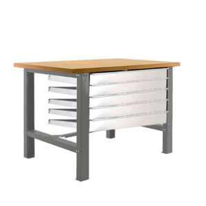 Banco de trabajo con tornillos y bandeja de MDF 35 mm. Incluye 5 cajones con gu¡as telesc¢picas. Es de color GRIS/MDF. Las dimensiones de este banco de trabajo son: 865x1200x750 mm. Y tiene una capacidad de carga de 600 kgs el estante. El caj¢n aguanta hasta 35 kgs y cuenta con gu¡as telesc¢picas para una mayor facilidad de uso. Está fabricado en Espa¤a y se monta fácil siguiendo las instrucciones.